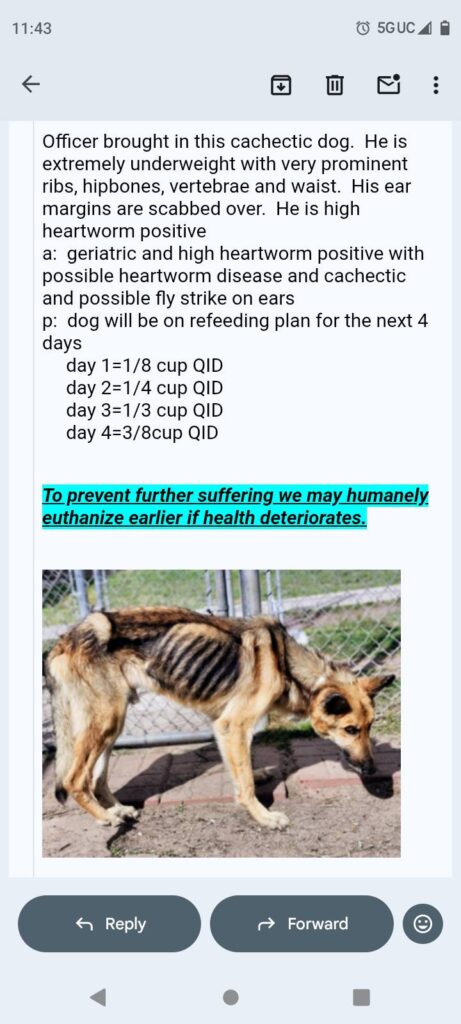 This emaciated dog’s history is unknown, but it is clear that he has been horribly neglected. According to shelter notes, not only is he starved, but he is “high” heartworm positive.
