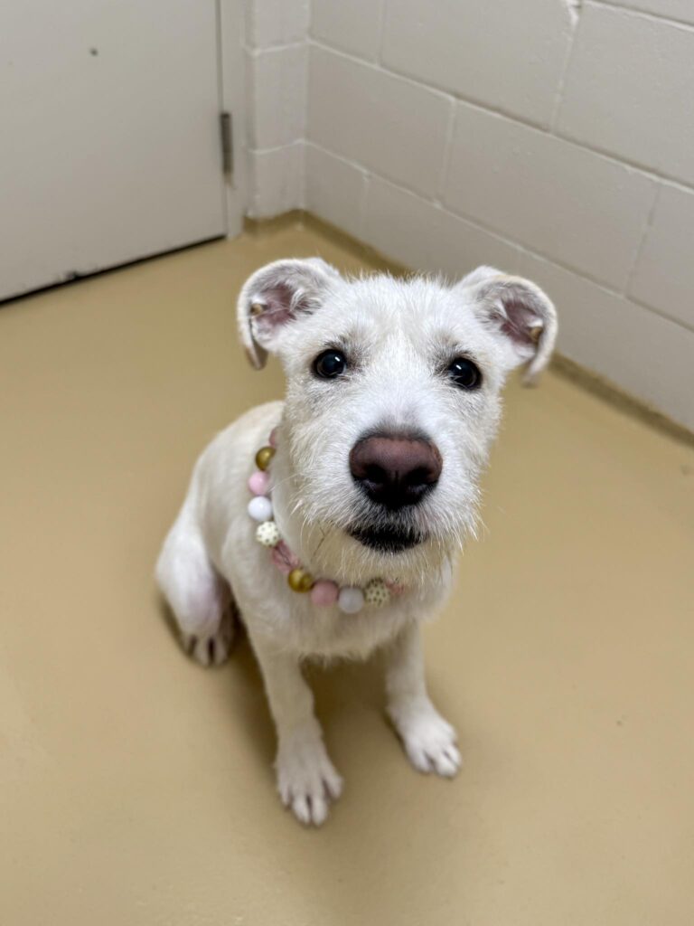 She’s super spunky and has a ton of pent up energy but WOW is she smart and willing to learn. She’s extremely treat motivated and learned very quickly that she wasn’t getting a treat unless she had her butt on the ground. When I went to put her necklace on she definitely treated it as a game of chase but then gave up and snuggled into me. She loves belly rubs too!