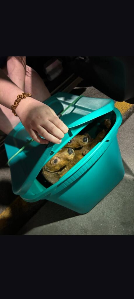 The puppies were reportedly found loose, huddled together on the side of the road and placed in a tote to keep them safe until officers could arrive.