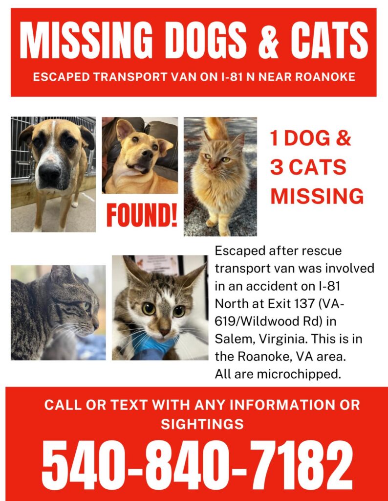 Salem, Virginia – Five animals escaped from a transport vehicle involved in an accident on February 28. The dogs and cats belonged to one of City Dogs & City Kitties Rescue’s rescue partners, and they managed to escape the vehicle because of a safety mechanism on the van which causes the windows to roll down upon impact.