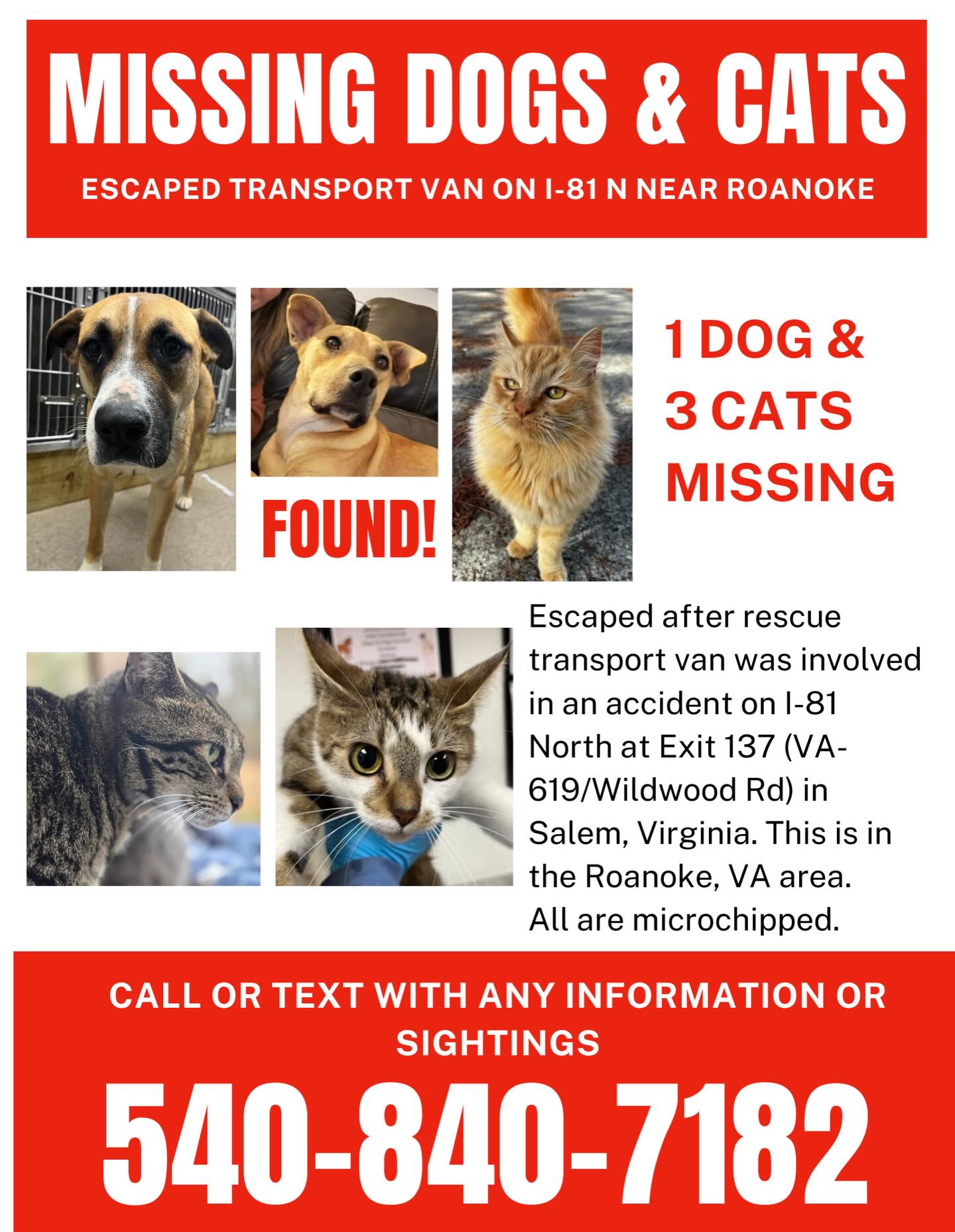The accident happened on I-81 North at Exit 137 (VA-619/Wildwood Rd). Anyone who spots one of the missing cats or dog is asked to call 540-840-7182. The animals will likely be frightened and may run. Please phone your tips in rather than attempting to chase.