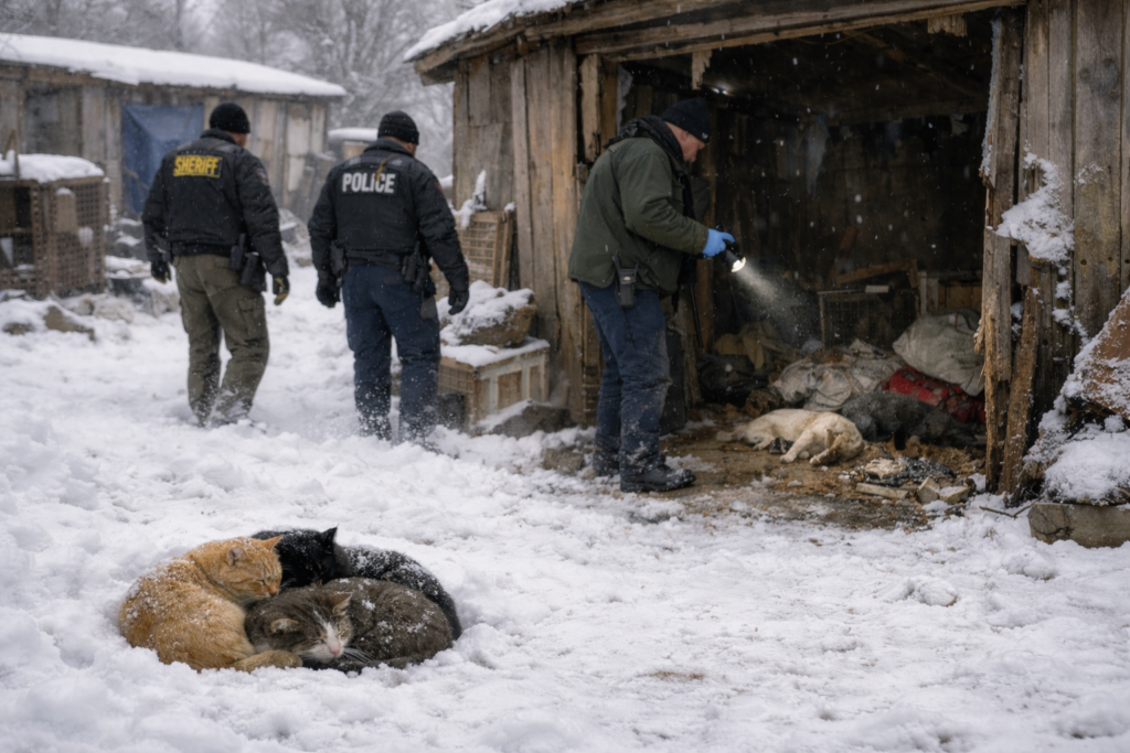On the day of the warrant execution, it was snowy and officials found numerous cats huddled together in an attempt to stay warm in the freezing temperatures.