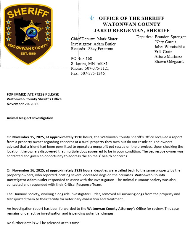 Watonwan County, Minnesota – Officials in Watonwan County made a grim discovery at a property where a woman was operating an animal rescue. The Watonwan County Sheriff’s Office said a woman was running the pet rescue on a friend’s property; the friend contacted the authorities because of the concerning situation.
