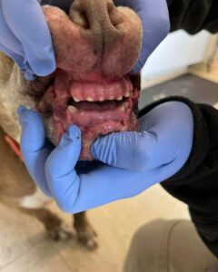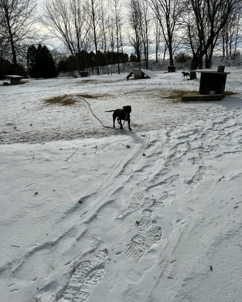 Agents discovered 11 dogs living outside, tethered on heavy tow chains. While dog houses were present, the houses were insufficient for the extreme weather conditions. The dogs had no access to unfrozen drinking water and temperature readings taken inside the dog houses indicated conditions unsafe for prolonged exposure. Several dogs also exhibited worn teeth, consistent with long-term chewing on chains.