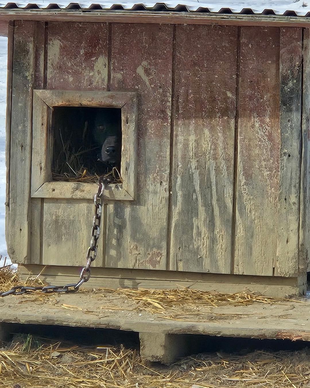 Agents discovered 11 dogs living outside, tethered on heavy tow chains. While dog houses were present, the houses were insufficient for the extreme weather conditions. The dogs had no access to unfrozen drinking water and temperature readings taken inside the dog houses indicated conditions unsafe for prolonged exposure. Several dogs also exhibited worn teeth, consistent with long-term chewing on chains.