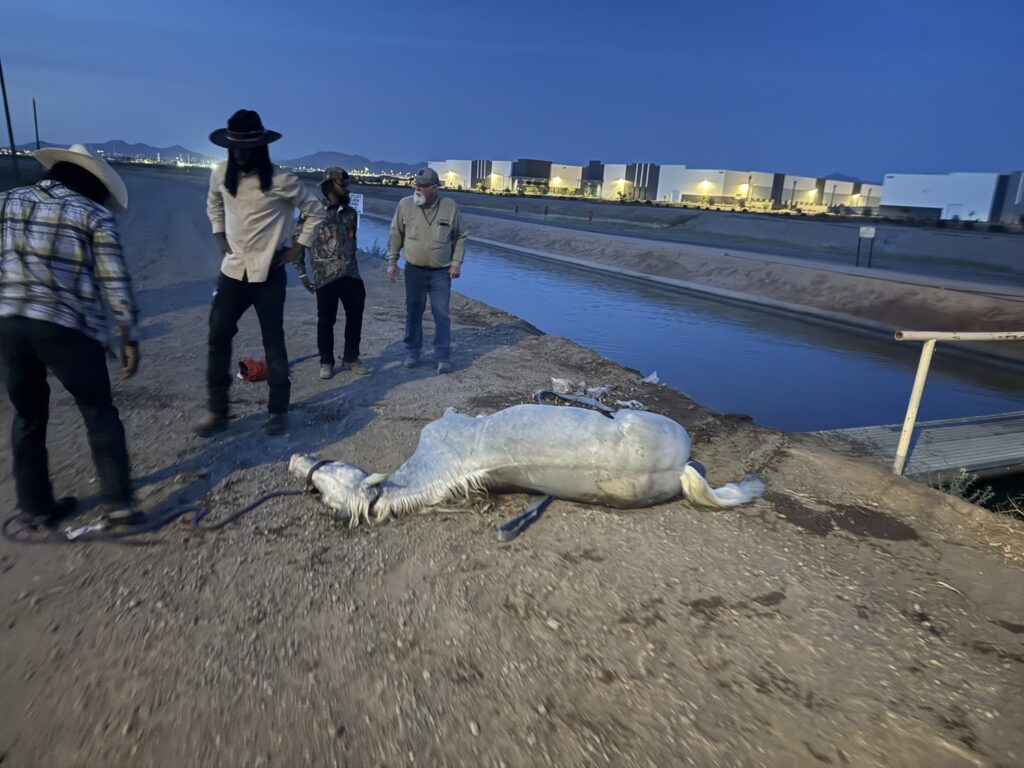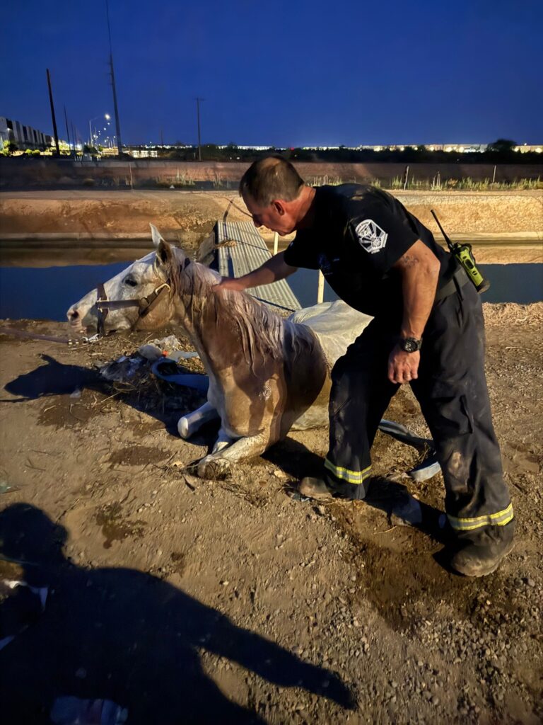 Mesa, Arizona – On Sunday night, a horse walking across a metal grate bridge slipped into a water-filled canal and was unable to escape. According to the Mesa Fire and Medical Department, the horse’s rider was able to get out of the canal uninjured, but the horse could not climb up the steep bank.