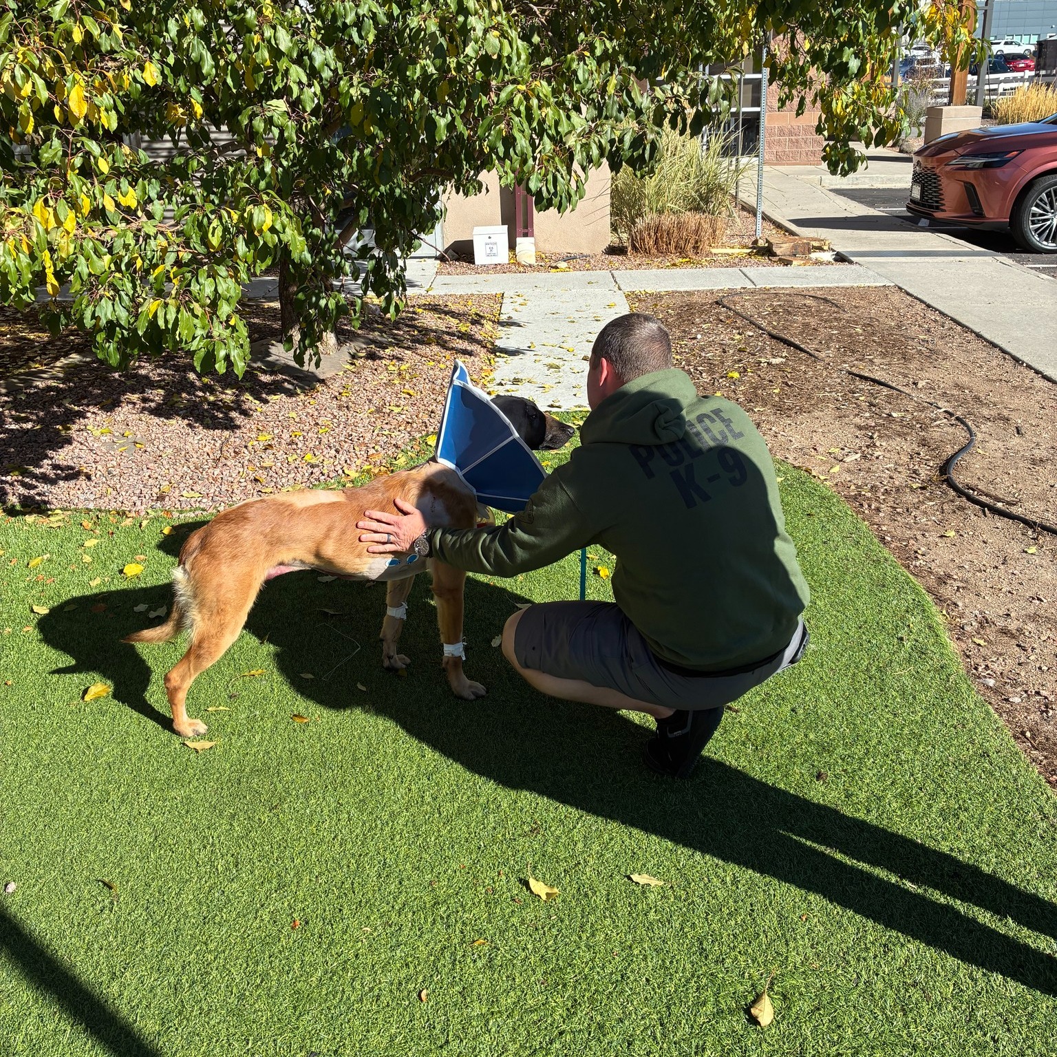 “He’s three days out from these extensive injuries, and he is, I mean, he amazes us every day. Incredible to see. As you know, we did have to amputate his leg to help save his life. And he is up walking. He’s wagging his tail. He’s he is just happy to be with his back, with his handler and his family.”