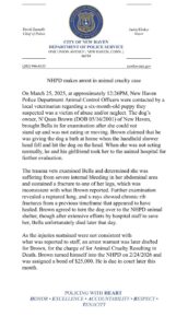 Brown brought Bella to a veterinarian last year because she could not stand up, was not eating, and could not move. Brown claimed a handheld shower head had fallen on Bella’s head, but a veterinary exam revealed a broken leg and severe internal bleeding. Despite veterinary intervention, Bella died.