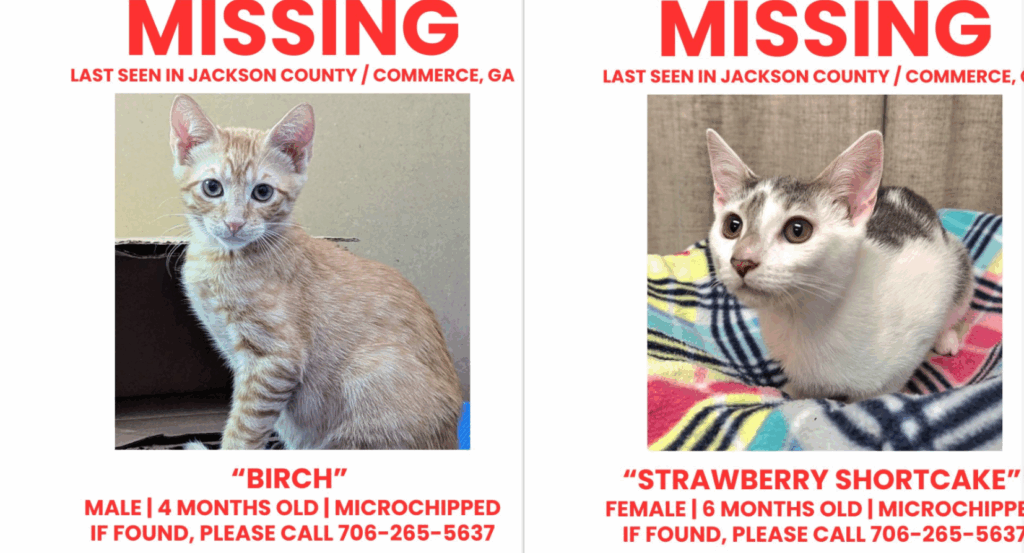 Our search continues for Birch and Strawberry Shortcake, our missing kittens. We are worried about their wellbeing and every moment without them is heavy. We are doing everything in our power to bring them safely home. If you see them, please reach out to us immediately at 706-265-5637.