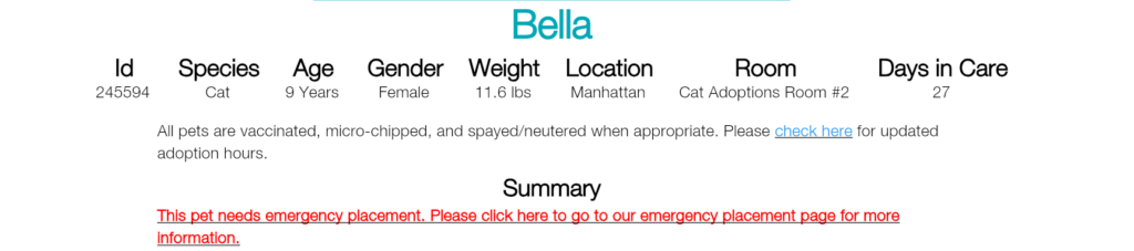 Bella’s profile indicates that she needs “emergency placement” and this means that time is of the essence.
