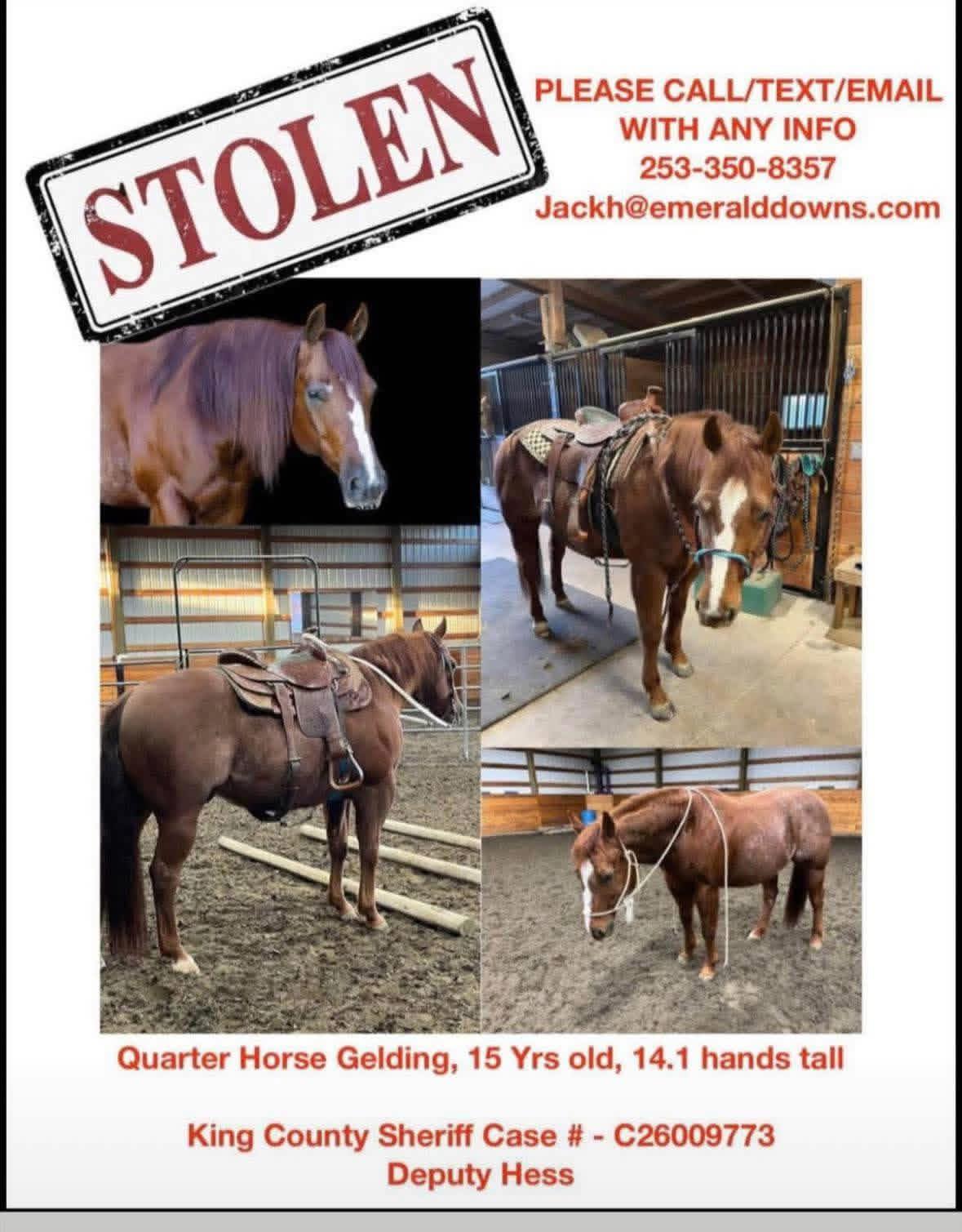 Enumclaw, Washington – A family is desperate to find their horse, Ruben, who was stolen from their property in Enumclaw, Washington, in the early morning hours on Thursday. According to reports, the 15-year-old Quarter horse was taken from his private farm stall at 1:50AM Thursday.