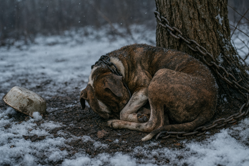 A responding trooper found the dog tangled in a chain outside, with no access to food, water, or shelter. After obtaining a search warrant, the authorities entered the home and found two caged dogs, multiple cats, and a dog chained to a couch – none of the animals had food or water available.